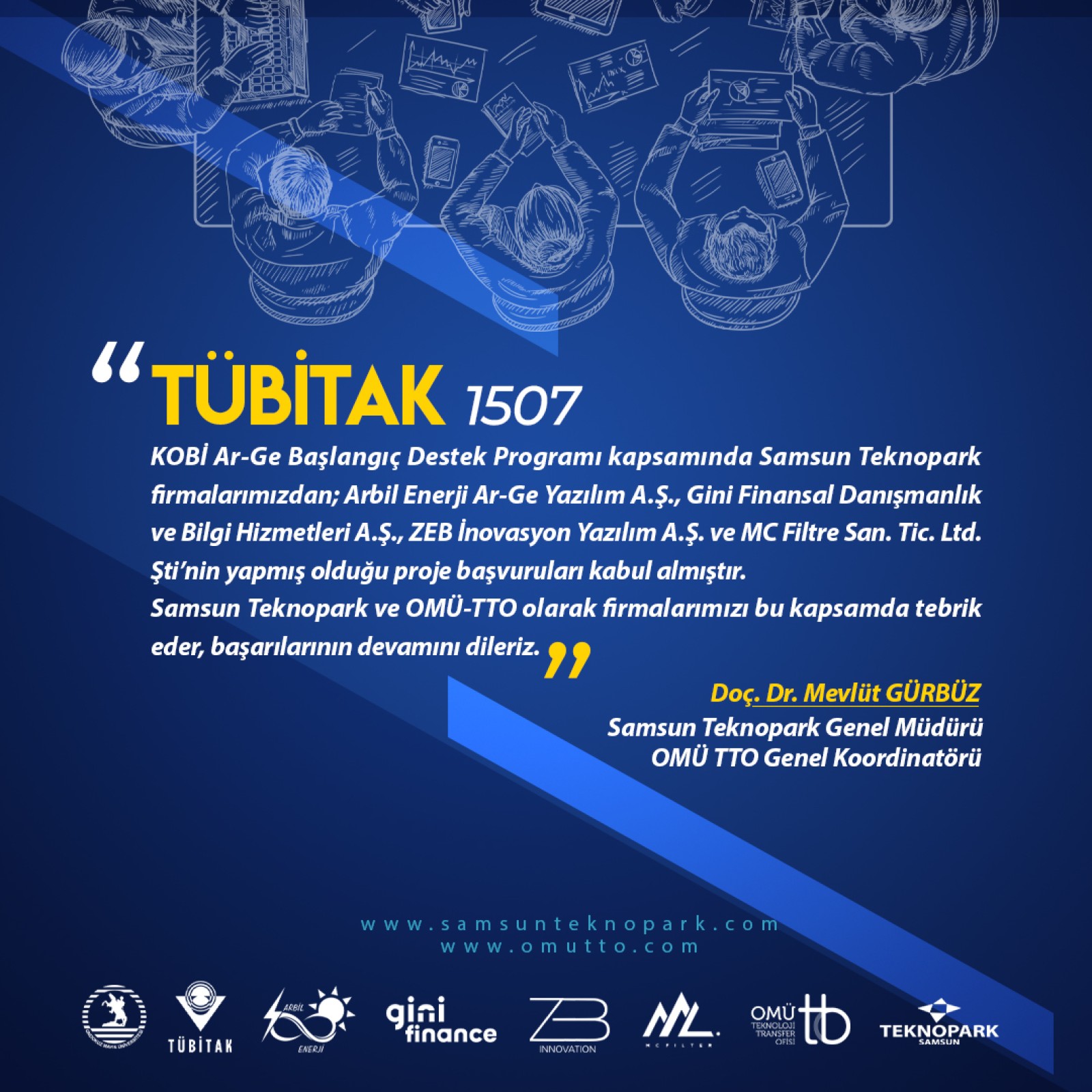 TÜBİTAK 1507 KOBİ Ar-Ge Başlangıç Destek Programı kapsamında Samsun Teknopark firmalarımızdan; Arbil Enerji Ar-Ge Yazılım A.Ş., Gini Finansal Danışmanlık ve Bilgi Hizmetleri A.Ş., ZEB İnovasyon Yazılım A.Ş. ve MC Filtre San. Tic. Ltd. Şti’nin yapmış olduğu proje başvuruları kabul almıştır. Samsun Teknopark ve OMÜ-TTO olarak firmalarımızı bu kapsamda tebrik eder, başarılarının devamını dileriz.