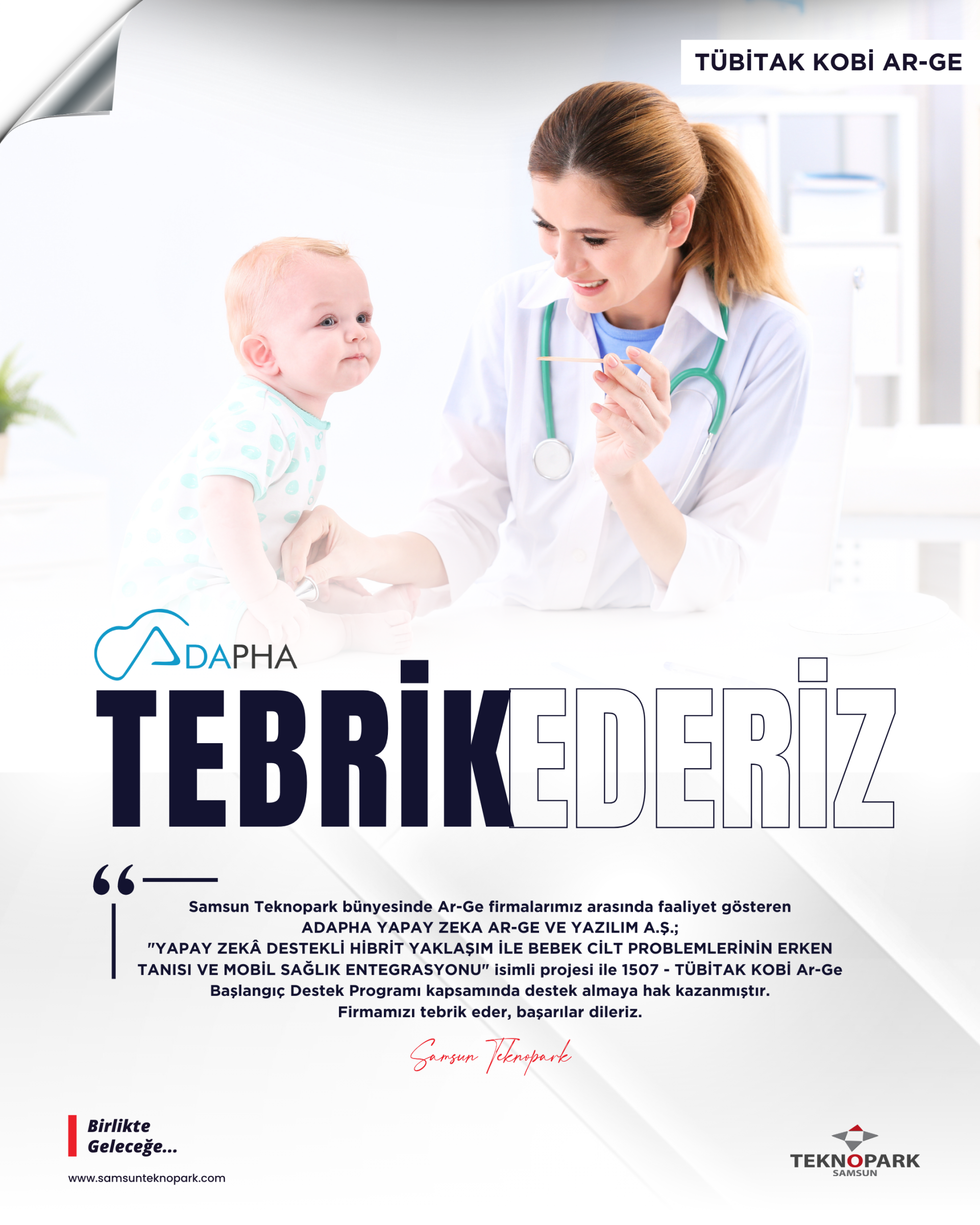 Samsun Teknopark bünyesinde faaliyet gösteren Ar-Ge firmalarımızdan ADAPHA Yapay Zeka Ar-Ge ve Yazılım A.Ş.; "YAPAY ZEKÂ DESTEKLİ HİBRİT YAKLAŞIM İLE BEBEK CİLT PROBLEMLERİNİN ERKEN TANISI VE MOBİL SAĞLIK ENTEGRASYONU" isimli projesi ile 1507 - TÜBİTAK KOBİ Ar-Ge Başlangıç Destek Programı kapsamında destek almaya hak kazanmıştır.